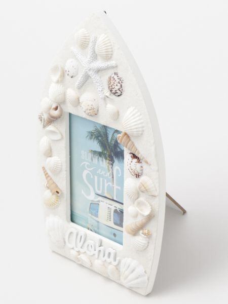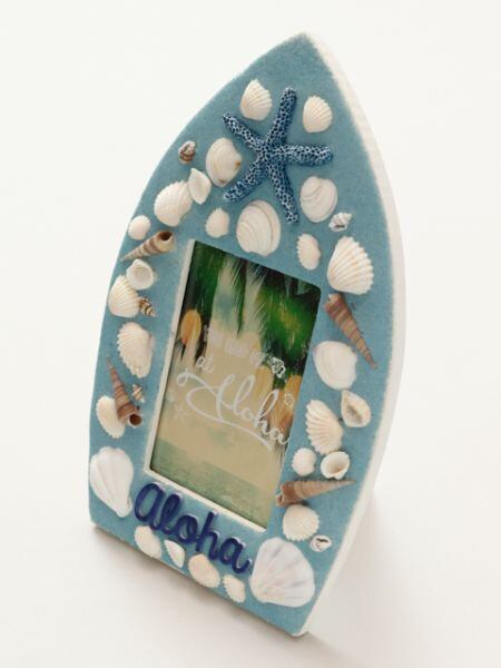 浜辺のきれいな貝殻を集めたようなサーフボード型のフォトフレームです!